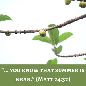 “Now learn this parable from the fig tree,” he says (Matt 24:32–33). When a fig tree’s branch becomes tender and puts out leaves, you know summer is near. In the same way, when you see all these things, know that it is near—right at the doors.